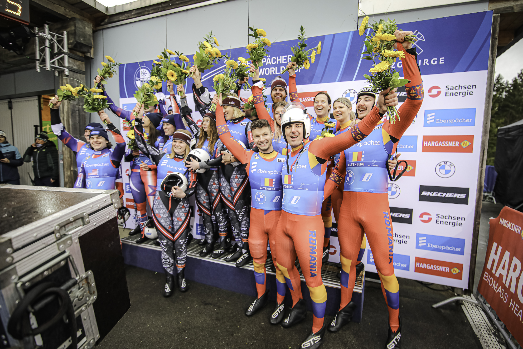 1,003 Sekunden länger als die Letten waren Emily Sweeney, Dana Kellogg/ Frank Ike, Tucker West und Chevonne Forgan/Sophia Kirkby im Eiskanal am Kohlgrund unterwegs. Die große Überraschung war jedoch das Team Rumänien auf Platz drei (Ioana-Corina Buzatoiu, Tudor-Stefan Handaric/Sebastian Motzca, Valentin Cretu sowie Raluca Stramatuaru/Mihaela Manolescu/1,856 Sekunden zurück).