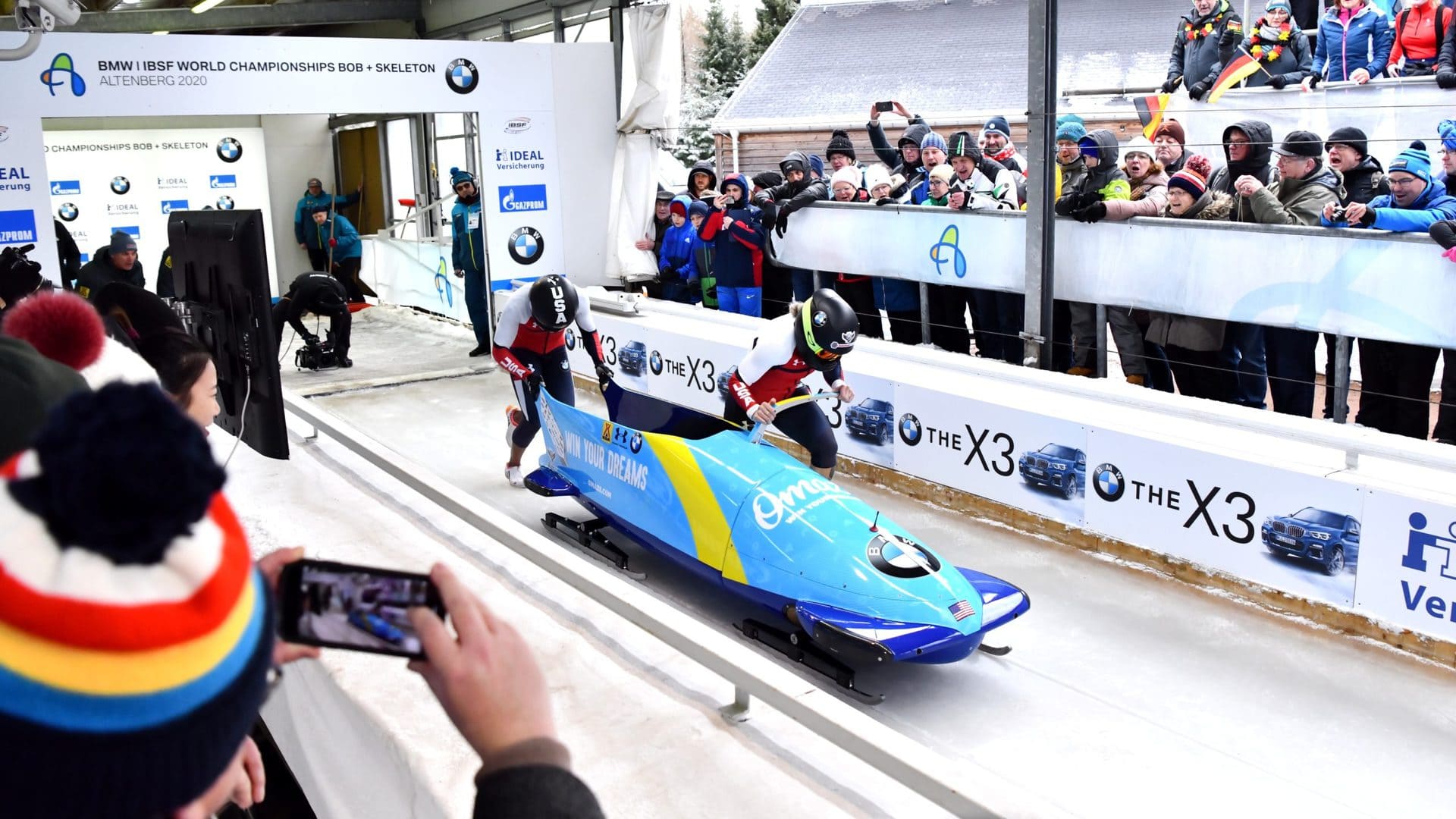 Kaillie Humphries/Lauren Gibbs (USA) sind die Halbzeit-Führenden im Frauen-Zweierbob bei den BMW IBSF Bob & Skeleton Weltmeisterschaften Altenberg 2020 presented by IDEAL Versicherung. In Altenberg fuhr die Olympiasiegerin von 2010 und 2014 in beiden Läufen Bestzeit und liegt vor dem Final-Tag mit 0,21 Sekunden vor Junioren-Weltmeisterin Kim Kalicki/Kira Lipperheide (GER). Weltcup-Gesamtsiegerin Stephanie Schneider (GER), in Altenberg mit Leonie Fiebig als Anschieberin, ist Gesamt-Dritte (0,54 Sekunden zurück). Olympiasiegerin und WM-Titelverteidigerin Mariama Jamanka (GER) fuhr im zweiten Rennlauf mit Annika Drazek noch von Rang sieben auf Platz vier. Die Europameisterinnen Nadezhda Sergeeva/Elena Mamedova (RUS) gehen als Siebte in den zweiten WM-Tag.