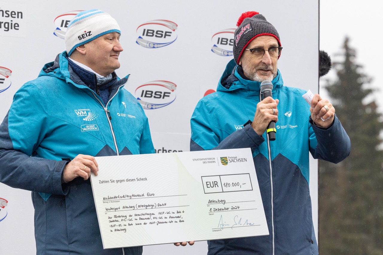 Sachsens Sportminister Armin Schuster hat heute anlässlich des IBSF Bob und Skeleton Weltcups am SachsenEnergie-Eiskanal Altenberg fünf Zuwendungsbescheide in einer Gesamthöhe von 180.000 Euro an die Wintersport Altenberg (Osterzgebirge) GmbH übergeben. Die heutigen Top-Athletinnen und Top-Athleten würdigte er persönlich bei der Medaillenvergabe.